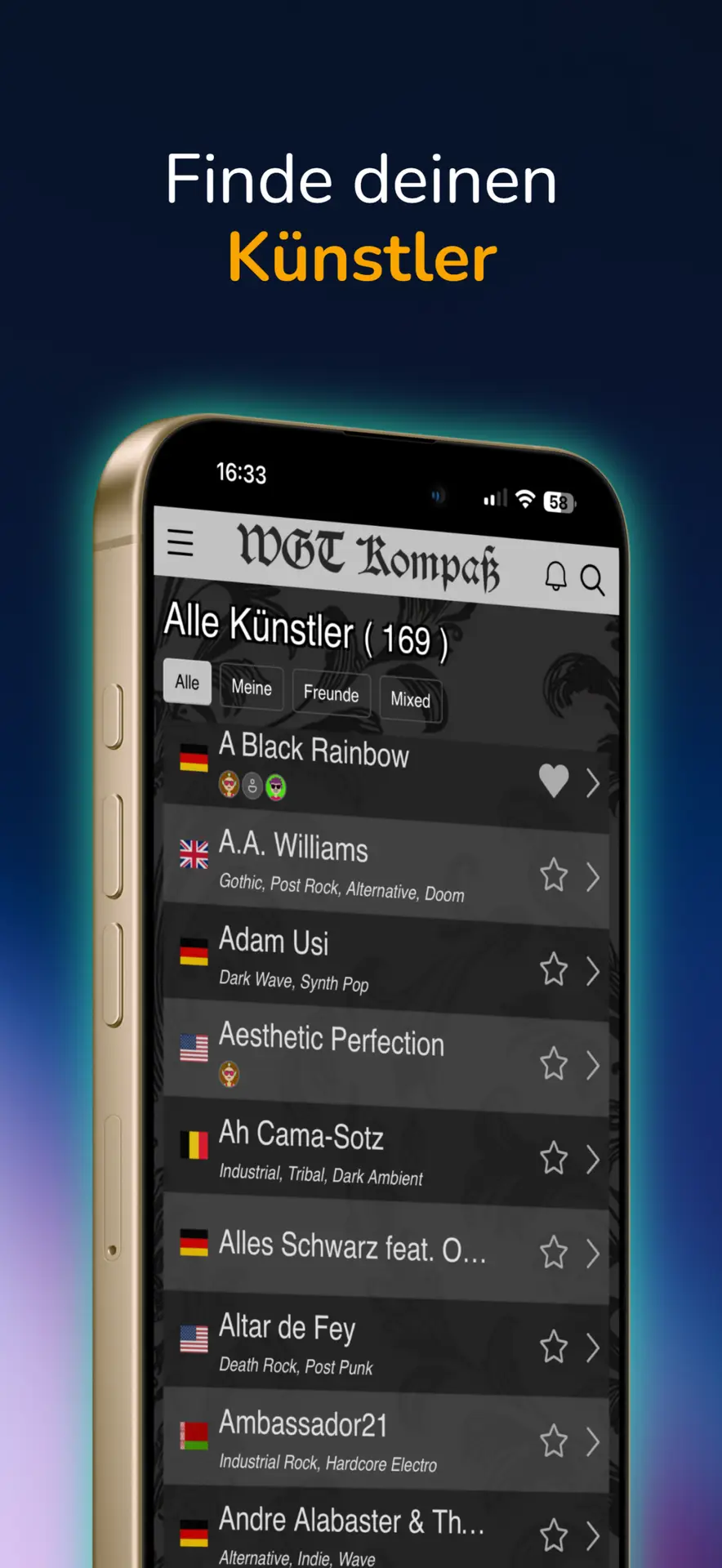 Infos zu allen Künstlern alle Programmpunkte inkl. Partys/Lesungen uvm. Alle Veranstaltungsorte des WGT Plane dein Festival in der App