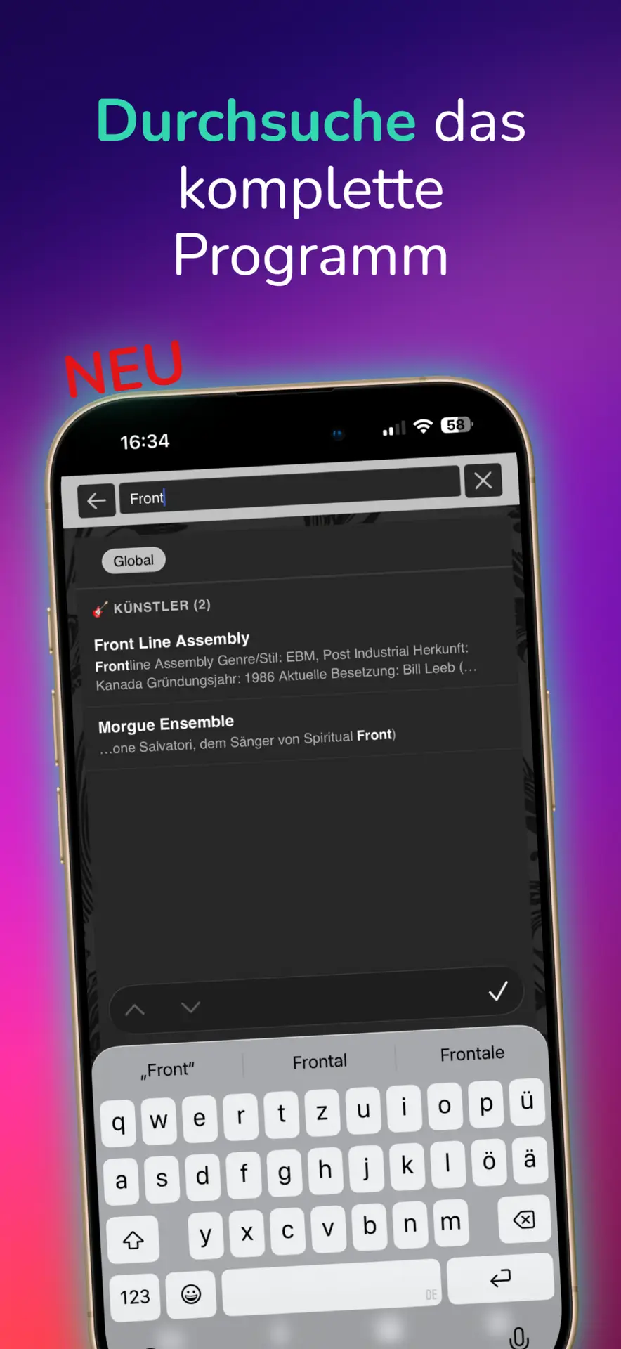 Globale Suche mit der Lupe in der Leiste ganz oben kannst du Künstler, Programmpunkte und Orte durchsuchen.NEU