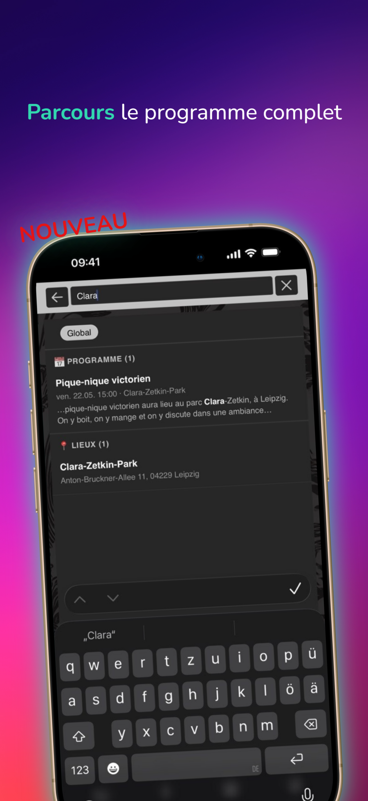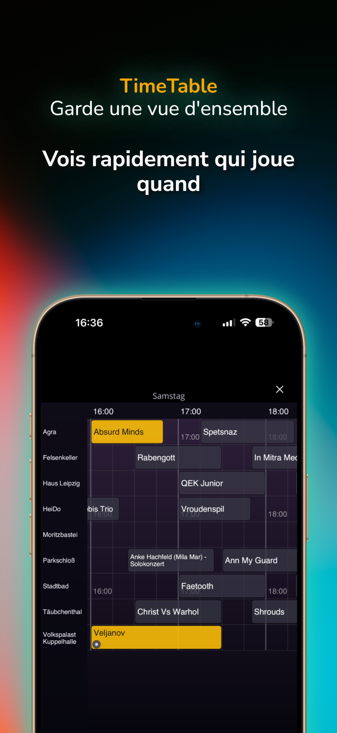 Détails sur le point du programme En un clic, tu obtiens des informations sur le programme : qui joue, où et quand. Tu peux également